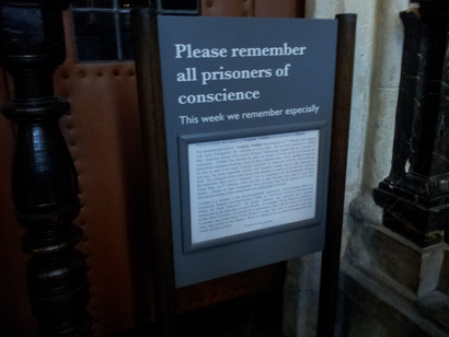 Når du går ind i Westminster Abbey i London, vil du på vej ind i kirken møde dette skilt, som fortæller om en samvittighedsfange, der pga. sin tro og overbevisning er fængslet af myndighederne i et eller andet land i verden.
