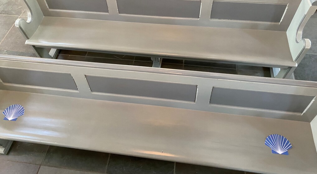 In St. Jakob's Church in Copenhagen, blue seashells are glued to the church benches at a distance of two meters, so it is easy to see where to sit. Photo: Lenemarie Løwe Olsen