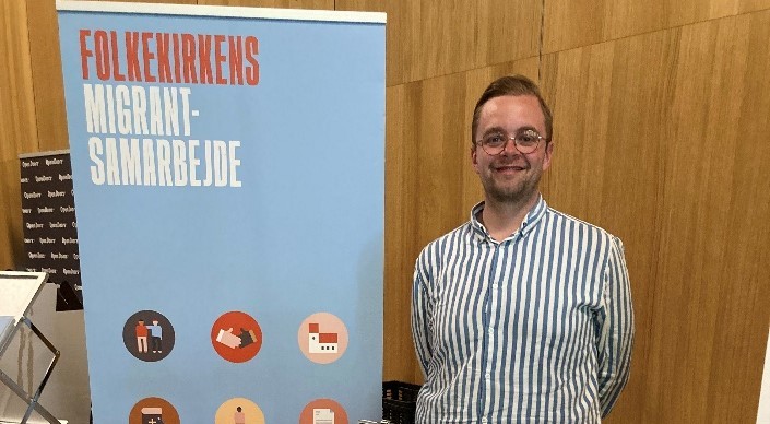 Lucas Skræddergaard fra Folkekirkens Migrantsamarbejde på samarbejdets stand på årskursus for kirkekulturmedarbejdere i år.