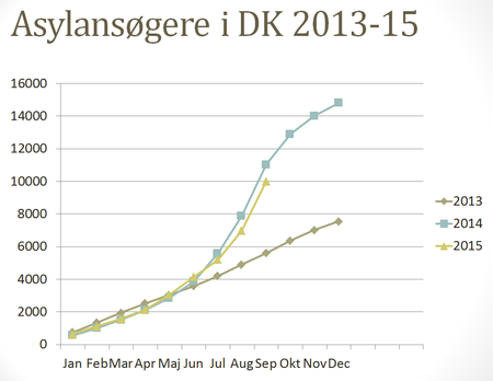 På trods af den massive mediedækning, er der ikke tale om en så eksplosiv stigning i det samlede antal registrerede asylansøgere i de nordiske lande, som man skulle tro. Antallet af registrerede asylansøgere i de fire nordiske lande i de første ni måneder af 2015 svarer nogenlunde til antallet af asylansøgere for hele 2014, nemlig ca. 110.000 personer. Der forventes således kun en moderat stigning i den nordiske region fra 2014 til 2015, afhængig af hvordan tallene for den resterende del af indeværende år falder ud. I Danmark følger antallet af asylansøgere samme niveau som i 2014 (se figur).