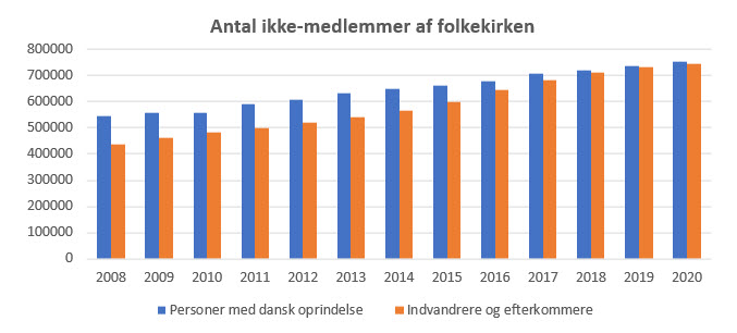 Antallet af ikke-medlemmer af folkekirken, er dog interessant og relevant at følge, da det viser en overvejende tendens - at det overordnede tab af medlemmer ikke skyldes etnisk danskeres udmelding, men i højere grad en stigende antal indvandrere og efterkommere som ikke melder sig ind i folkekirken.