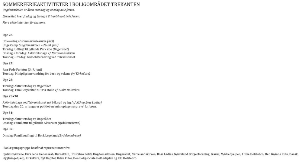 Foreløbig oversigt over sommerferieaktiviteter i Trekanten kan ses her.