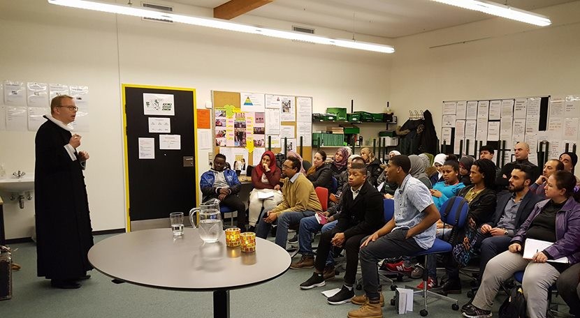 Selvom mænd i kjoler givetvis er et mere almindeligt syn på de sydlige breddegrader, så var det alligevel noget af en øjenåbner for de fremmødte flygtningestuderende, at der også findes danskere, for hvem troen spiller en personlig og synlig rolle. Sognepræst og rådsmedlem i Folkekirkens mellemkirkelige Råd, Christian Roar Pedersen, aflagde det lokale VUC et besøg og fandt en engageret og lyttende skare: