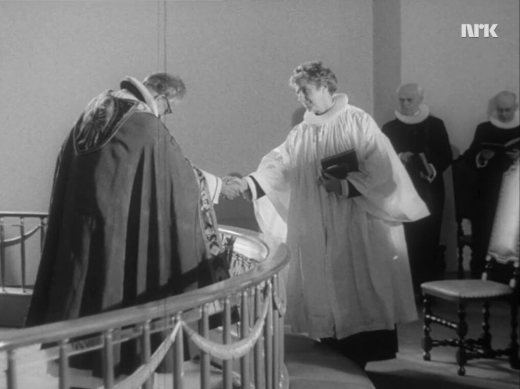 Første ordination af kvinde til præsteembede i Norge. Biskop Kristian Schjelderup og ordinant Ingrid Bjerkås. Foto: NRK, 23. marts 1961. Se video her.