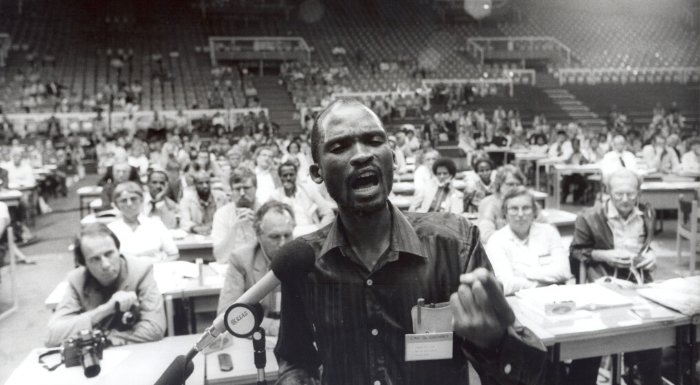 Timothy taler ved en høring om situationen i Sydafrika på Det lutherske Verdensforbunds generalforsamling i Budapest 1984. Foto: LVF.