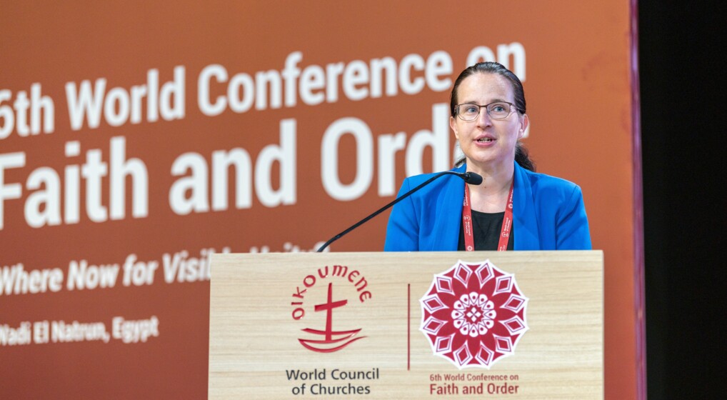 Maria Munkholt på talerstolen under konferencen i Logos Center i Wadi el Natrun i Egypten. FOTO: Albin Hillert/WCC