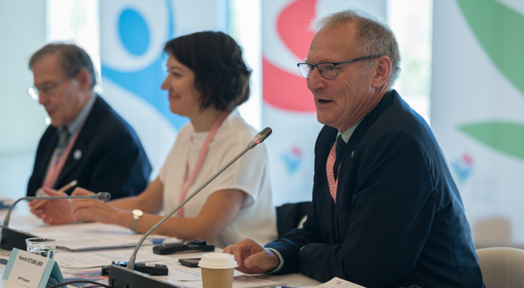 Henrik Stubkjær holder møde med det nyvalgte råd i Det lutherske Verdensforbund. Ved siden af ham sidder generalsekretær Anne Burghardt. Foto: LVF/Albin Hillert.