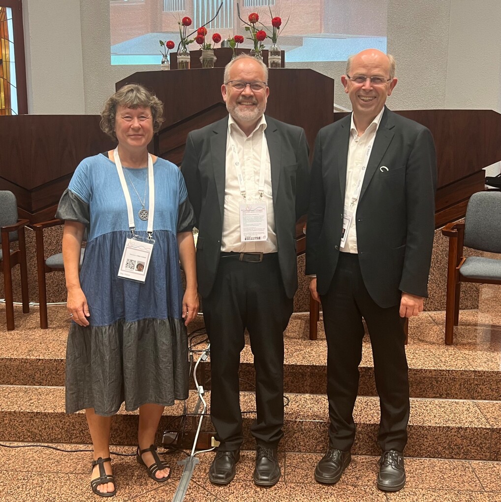 Biskop Marianne Christiansen og biskop Elof Westergaard ved siden af den tyske biskop Gothart Magaard, Slesvig-Holsten stift. De deltog sammen i et arrangement om fred og forsoning mellem Danmark og Tyskland, hvilket fandt sted på Kirkernes Verdensråds generalforsamling i Karlsruhe i august 2022 - et af mange eksempler på det gode samarbejde mellem kirkerne på begge sider af grænsen. Foto: Nordkirche.