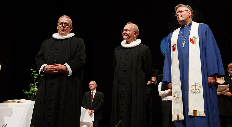 Folkekirken og Metodistkirken har i mange år haft et meget tæt samarbejde. På billedet ses domprovst Niels Christian Kobbelgaard (t.v.), domprovst Anders Gadegaard og Christian Alsted, biskop i Metodistkirken, (t.h.) medvirke i afslutningsgudstjenesten til Danske Kirkedage i Aalborg 2013. Foto: Danske Kirkedage