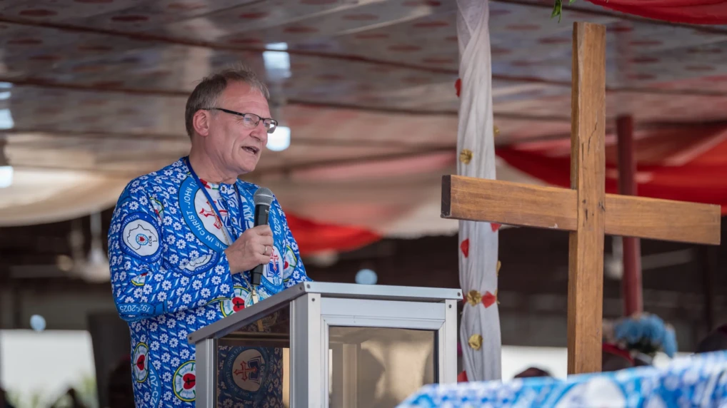 Henrik Stubkjær taler til deltagerne på jubilæumsdagen, fejringen af den 100. årlige konvention for den lutherske Kristi kirke i Nigeria. Foto: LVF/Albin Hillert