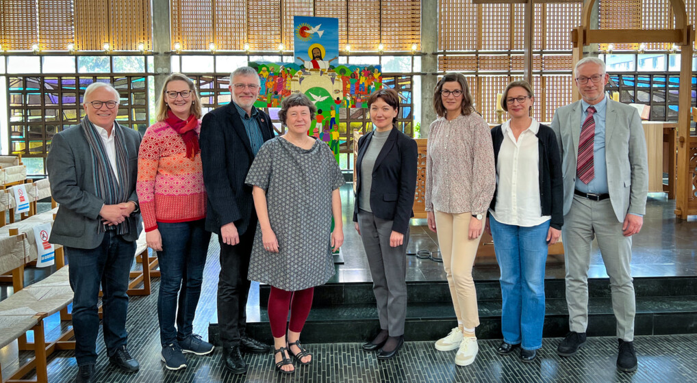 Billede af rejsedelegationen fra Haderslev stift. Foto: Fra venstre: Biskop Marianne Christiansen, domprovst Torben Hjul Andersen, provst Børge Munk Povlsen, stiftskontorchef Lars Kjærgaard, provsterne Kirsten Sønderby, Grete Wigh-Poulsen, Dorte Volck Paulsen