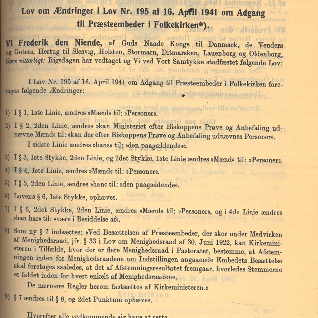 I 1947 blev det lovgivet fra Folketinget, at kvinder kunne ordineres til præsteembede i folkekirken. Fra Lovtidende.