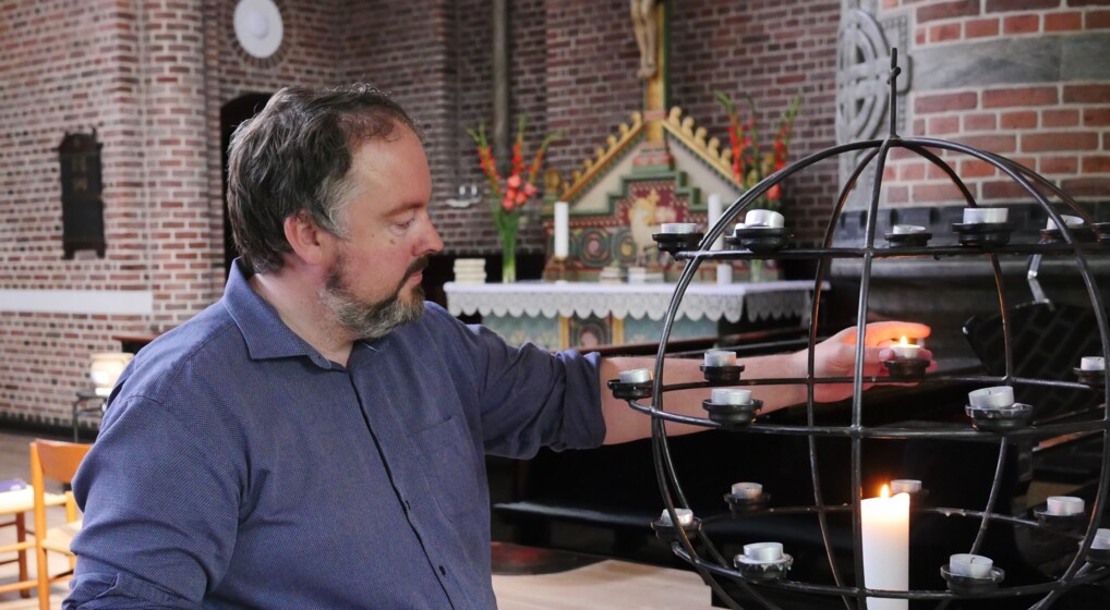 Keith Gray tænder lys i lysgloben i Apostelkirken på Vesterbro i København.
