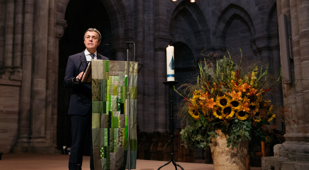 Den daværende schweiziske udenrigsminister Ignazio Cassis taler på CPCEs generalforsamling i 2018 ved festgudstjenesten i Basel i anledning af taksigelsesdagen i Schweiz. Foto: CPCE.
